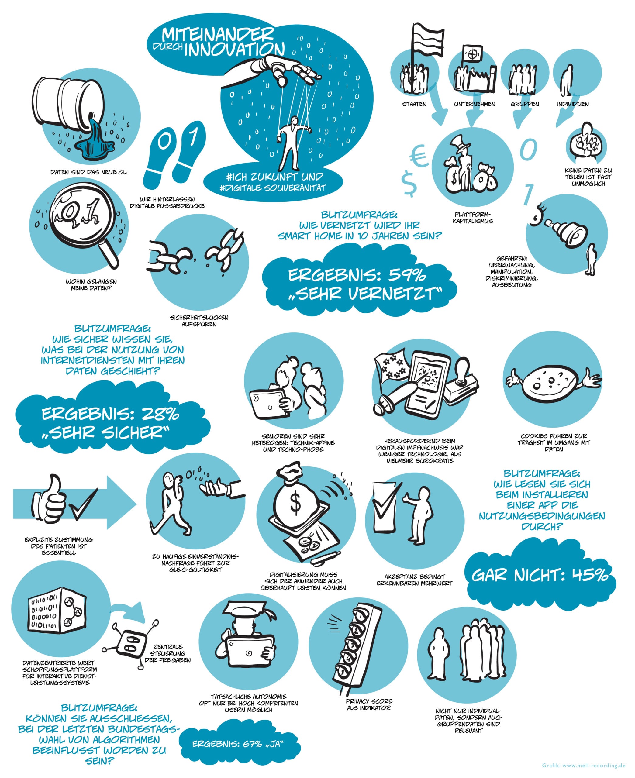 „Digitale Souveränität ist heute relevanter denn je: In unserem Alltag sind digitale Dienstleistungen längst selbstverständlich geworden. Wir nutzen Apps auf unserem Smartphone um die Wettervorhersage abzurufen, um Weihnachtsgeschenke zu bestellen oder um Arzttermine zu vereinbaren. Dabei wissen wir oft jedoch nicht, welche persönlichen Daten wir teilen, mit wem wir sie teilen und wie sie weiterverarbeitet werden. Die inzwischen obligatorischen Datenschutzerklärungen könnten zwar Aufschluss über die jeweilige Datenverarbeitung geben, sind für die meisten Menschen aber unverständlich oder zeitraubend und werden daher selten gelesen.