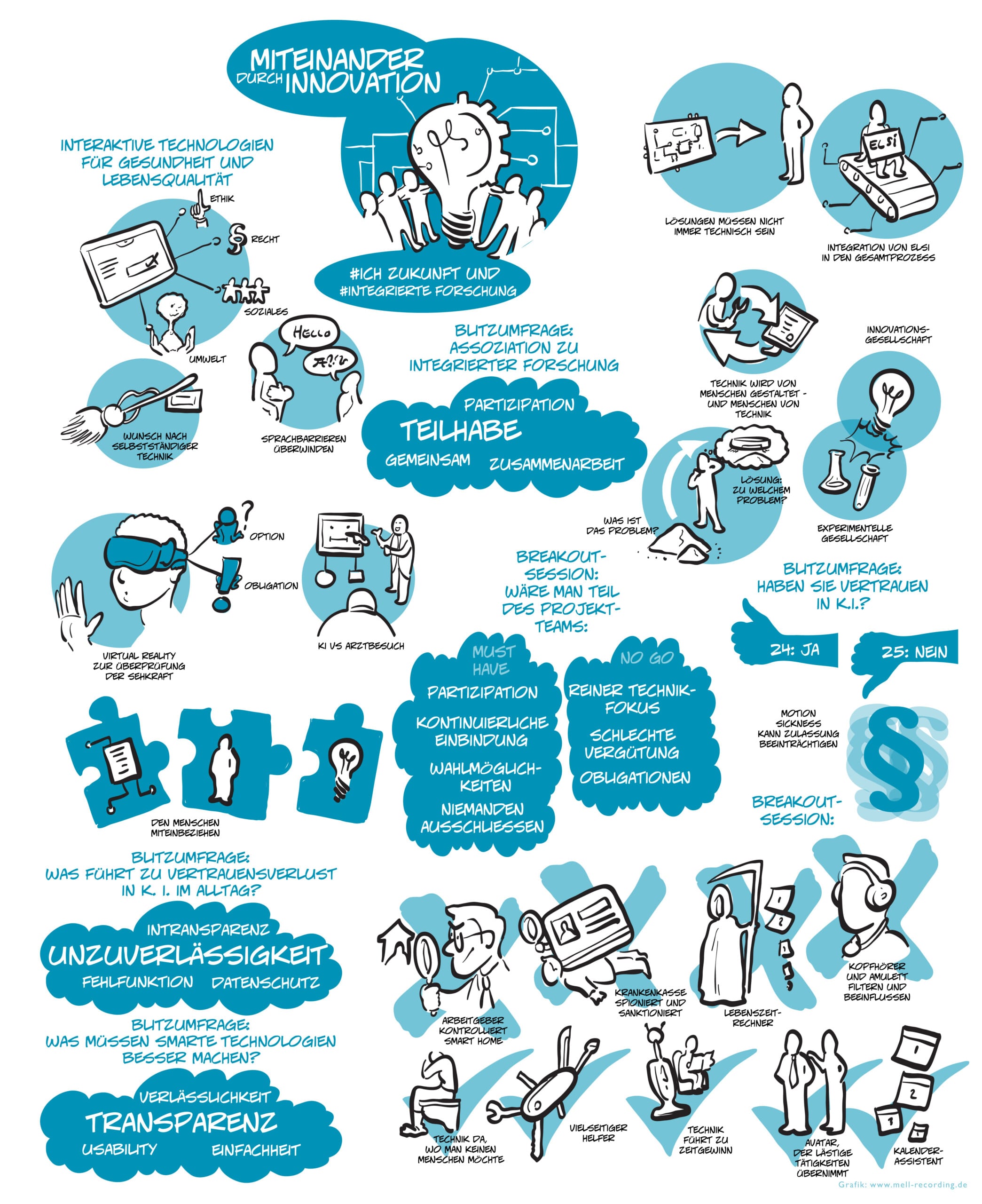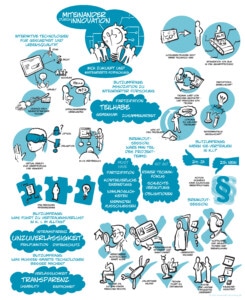Die interaktive Veranstaltung bot einen Mix aus Keynote-Vortrag, interaktiven Workshops und der Podiumsdiskussion „Auf ein Wort“. Dokumentiert und kommentiert wurde die Veranstaltung vom Illustrator Carsten Mell (Graphic Recording) und dem Autor Karl Olsberg (Schlusswort als externer Beobachter).