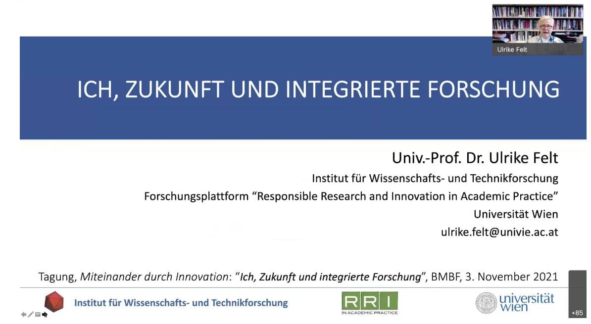 In Ihrer Keynote widmete sich Prof. Dr. Ulrike Felt der Frage nach der Notwendigkeit von Integrierter Forschung. Gleich zu Anfang stellte sie fest, dass wir in einer von Technik und Wissenschaft geprägten Gesellschaft leben, in der Fortschritt und konstanter Wandel an der Tagesordnung stehen.