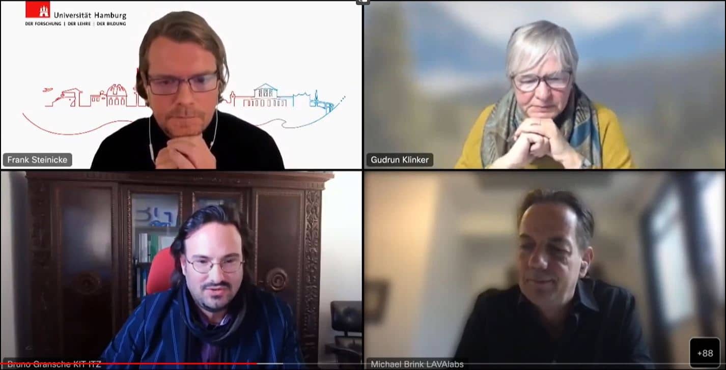 „Wir tun mehr mit der Gesellschaft, als eine neue Schnittstelle einzufügen. Wir verändern sie grundlegend“, sagte Dr. Bruno Gransche zu Beginn der Runde. Durch COVID-19 seien die sich bietenden Möglichkeiten um Kontakt mit Mitmenschen zu halten deutlich geworden. Eine Tele-Präsenz bei der Familienweihnachtsfeier sei immerhin besser als gar keine Teilhabe, so Prof. Klinker. Vielleicht werde es in ein paar Jahren sogar schon möglich sein, virtuell am Tisch zu sitzen. Bei aller Euphorie für die neuen Möglichkeiten von virtuellen Treffen sei es jedoch wichtig, nicht ohne Not auf physische Treffen zu verzichten, betonte Dr. Gransche. Allein der Weg von A nach B schaffe Begegnungsräume und Möglichkeiten für zufällig entstehende Gespräche, die für unser soziales Miteinander wichtig seien. In Bezug auf technologische Hürden wiesen die Teilnehmenden besonders auf die mangelhafte Verfügbarkeit hin: Viele eigentlich für die Virtuelle Realität konzipierte Spiele würden in der Praxis nicht mit Brille, sondern am Handy gespielt, betonte Michael Brink. Das Vorankommen von Social XR hänge daher auch von einer umfassenden Digitalisierung in Deutschland ab. Technik dürfe nicht nur ein Luxusgut sein. Auf die Frage, wie es um den Standort Deutschland im internationalen Vergleich stehe, zeigte sich die Gruppe nüchtern: „Aus Deutschland heraus werden wir nicht die Welt verändern“ stellte Michael Brink aus unternehmerischer Perspektive fest. Dafür fehlten einfach die Ressourcen. Dennoch könnten kleinere Beiträge zu Weiterentwicklung der Technologie geleitet werden.“ Ein Beispiel sei etwa der europäische der DSGVO oder die lange Tradition der Technikfolgenabschätzung. Zum Ende der Diskussion wurden noch einmal mögliche Gefahren thematisiert: „Wer ist mein Gegenüber? Was ist Realität, was nur ein Fake?“ Diese Fragen stellen sich bereits heute und werden in Zukunft noch schwieriger zu beantworten sein.